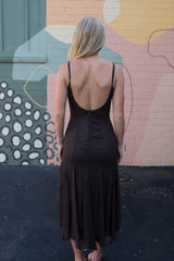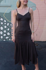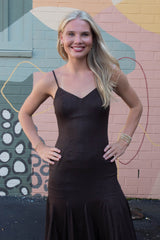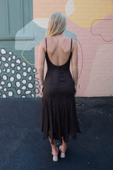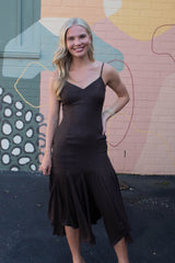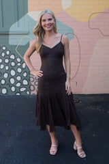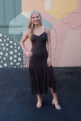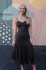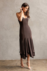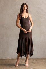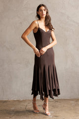 Turn heads in the Phoebe Shimmering Asymmetric Hem Dress. This brown beauty features sparkling metallic thread and an eye-catching asymmetrical hem that dances with every step. Adjustable spaghetti straps and a sweetheart neckline add flirty charm, while the sleeveless design keeps it breezy. A back zipper ensures a perfect fit, and the midi length strikes just the right balance between elegant and fun. Perfect for making a dazzling statement wherever you go!