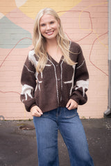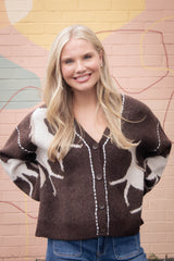 Add a touch of whimsy to your wardrobe with the Rebekah Contrast Stitch Horse Cardigan. Featuring playful horse graphics and eye-catching contrast stitching, this brown cardigan combines fun with cozy long sleeves and a flattering V-neck. The button-down design makes it easy to layer for any occasion, bringing charm and comfort together in one stylish piece!