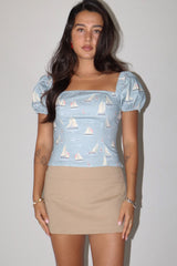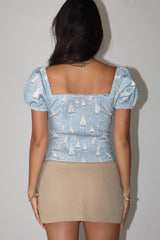 Catch the breeze in this charming sailboat print top! Featuring a classic cotton construction and playful puff sleeves, it's the perfect piece for adding a whimsical touch to your everyday wardrobe. Whether you're heading to the coast or just dreaming of adventure, this cheerful design brings a sense of fun and freedom to any outfit. Comfortable, versatile, and undeniably cute—your new favorite top awaits.