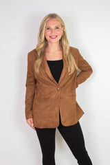Elevate your look with the Miranda Faux Suede Blazer in rich cognac. This playful piece features a soft faux suede fabric, a chic collar, and handy front pockets perfect for stashing little essentials. With padded shoulders and a sleek single button closure, it adds a dash of structure and sass to any outfit. Perfect for turning heads from day to night!