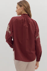 Elevate your wardrobe with the Anya Floral Embroidered Top in rich burgundy. This sophisticated long-sleeve piece features delicate floral embroidery that adds timeless elegance, while the charming ruffle collar and decorative front buttons create a polished, intentional look. Button details at the wrists provide a refined finishing touch. Crafted from a quality woven fabric with a semi-fitted silhouette, this top offers a flattering shape without stretch, making it perfect for layering or wearing solo. A versatile essential that transitions seamlessly from office to evening occasions.