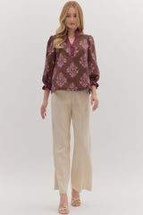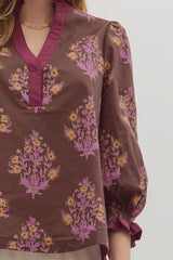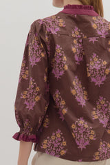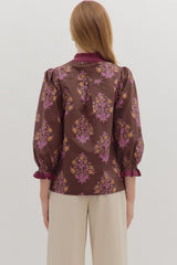 The Maisy Floral Blouse in rich chocolate features a flattering semi-fitted silhouette that enhances your shape without cling. Its 3/4 sleeves and delicate floral print add feminine charm, while the ruffle-trimmed V-neck creates an elegant focal point. Crafted from woven fabric with no stretch, this blouse offers a polished look perfect for both workdays and weekend outings. Elevate your wardrobe with a versatile top that combines timeless style and comfortable wear.