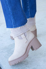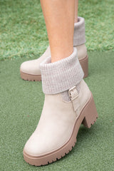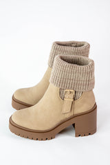 Get ready to strut your stuff in the Rhoda Foldover Platform Bootie! This unique sand nubuck boot features a foldover knit shaft and buckle detail, adding a touch of quirkiness to any outfit. With a heeled platform for extra height, you'll be sure to stand out in style!