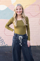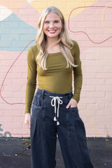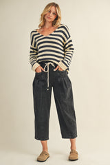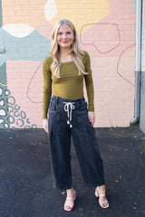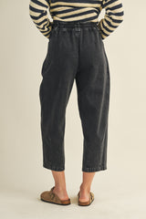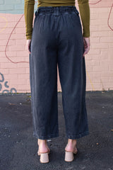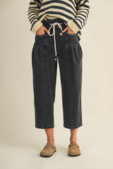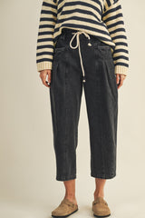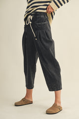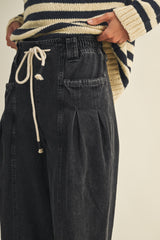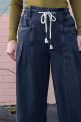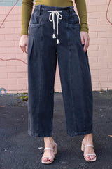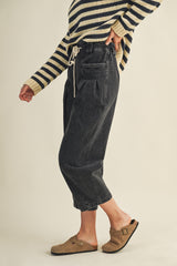 Raya Drawstring Barrel Leg Pants, Black Denim