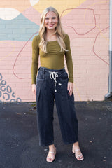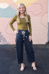 Step out in style and comfort with the Raya Drawstring Barrel Leg Pants in black denim. Featuring a playful elastic drawstring waist for a perfect fit, these pants boast trendy barrel legs and charming pleated details. Practical side pockets and thoughtful seam accents add both function and flair. Perfect for those who love casual cool with a twist!