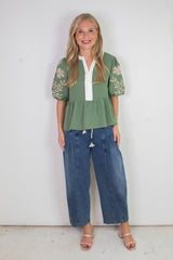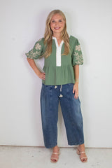 Step out in style and comfort with the Raya Drawstring Barrel Leg Pants in washed denim. Featuring a playful elastic drawstring waist for a perfect fit, these pants boast trendy barrel legs and charming pleated details. Practical side pockets and thoughtful seam accents add both function and flair. Perfect for those who love casual cool with a twist!