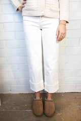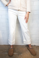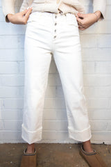 Score a stylish addition to your wardrobe with the Luna Cuffed Denim Pant in Bleached White by Sanctuary. These versatile pants feature cuffed (optional) hems, a button closure, and side pockets, making them perfect for any occasion. Made with durable denim, they offer both comfort and style!
