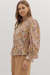 Elevate your everyday wardrobe with the Celina Ruffle Neck Top, a sophisticated piece that combines timeless style with modern details. This long-sleeve top features a charming ruffle neckline and eye-catching floral mixed print that brings dimension to any outfit. The distinctive balloon sleeves add a touch of elegance, while the functional button detail at the wrist offers both style and practicality. Crafted from a woven fabric with a semi-fitted silhouette, this versatile top drapes beautifully without clinging. Perfect for layering or wearing solo, the Celina is an essential addition to your seasonal collection.