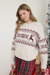 Stay cozy and stylish with the Granger Cable Knit Sweater in Ivory. Featuring intricate snowflake and deer details, this relaxed-fit sweater combines classic winter charm with moderate stretch for comfortable movement. Its thick, textured fabric ensures warmth during chilly days, making it an ideal choice for layering or wearing on its own. Elevate your cold-weather wardrobe with timeless design and dependable comfort.