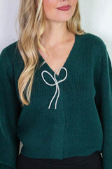 Add a touch of sparkle to your look with the Marie Sparkly Bow Cardigan in dark green. Featuring a dazzling rhinestone bow detail and a clever hidden double snap closure, it's as charming as it is practical. Playful long balloon sleeves and a flattering V-neckline make it perfect for layering with your favorite outfits while turning heads wherever you go!