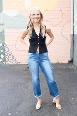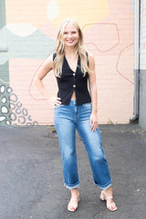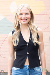 Elevate your wardrobe with the Blodwyn V-Neck Sweater Vest in sleek black, featuring eye-catching gold buttons for a dash of glam. This sleeveless style is perfect for layering or wearing solo when you want to show off your playful side. Whether dressed up or down, it adds a chic twist to any outfit!