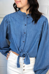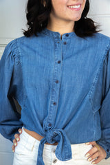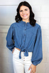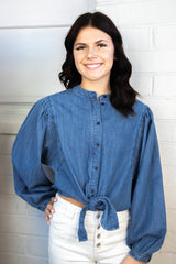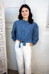 Add a playful pop to your wardrobe with the Nola Tie Front Volume Blouse. This blue slate blouse features a unique tie front detail, long sleeves, and a button down closure. Whether you're going for a quirky office look or a casual weekend outfit, this blouse will add a touch of fun to any ensemble!