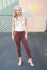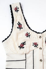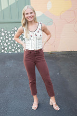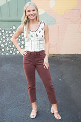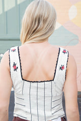 This playful Rose Bud Knit Top in an ivory combo features delicate rose bud embroidery and lace details on the bust and straps. Striped accents add a fun twist, while the button-front and scoop neck create a flattering silhouette. Finished with a charming contrast scalloped trim, this top brings a sweet, feminine touch to any outfit!