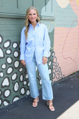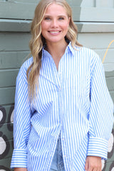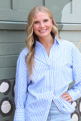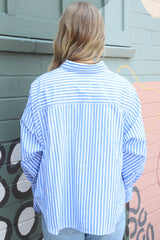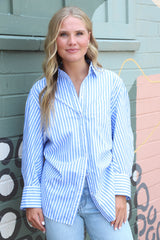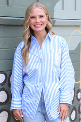 Embrace effortless style with this oversized, collared button-down shirt featuring playful blue Oxford stripes. Long sleeves and a round hem add a relaxed vibe, while the chest pocket brings a touch of classic charm. Perfect for layering or wearing solo, it’s your go-to for a laid-back yet polished look!