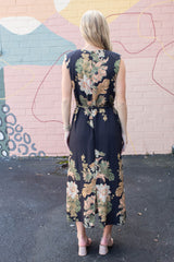 Step into effortless charm with the Alaina Floral Tie Waist Dress in Black. This playful midi features a vibrant floral print and sleeveless design, perfect for warmer days. Padded shoulders give a touch of structure, while the tie waist highlights your silhouette. A back button closure and round neck complete the look with subtle sophistication. Ideal for brunch or garden parties, this dress blends comfort with flirty style!