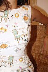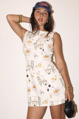 Slip into effortless style with this charming cafe print mini dress. The sleeveless silhouette keeps things breezy and cool, while the convenient zip back closure makes getting dressed a breeze. Perfect for casual outings, weekend adventures, or whenever you want to look put-together without trying too hard. The cream base with delicate printed details adds a touch of whimsy to your everyday rotation.
