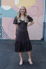 The Ana Mesh Flower Midi Dress in warm brown features a charming sweetheart neckline and flirty short puff sleeves for a playful vibe. Its midi length and ruffled hem add a fun, twirly touch, while the back zipper closure ensures a perfect fit. Ideal for sunny days and special occasions alike, this dress blends romantic details with effortless style!