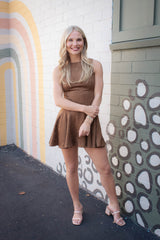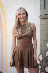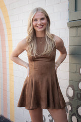 Step out in style with the Indi Faux Suede Flare Dress in Camel Brown. This playful mini dress features a chic boat neck and a breezy flare hem that adds movement to every step. Sleeveless for warm days and a smooth back zipper closure for easy wear, it’s perfect for turning heads wherever you go!