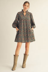 The Leena Printed Dress in Hunter Green combines elegant design with practical details. Featuring an empire silhouette and a flattering split neck, this woven, non-stretch dress is fully lined for comfort. The 3/4 sleeves have a slight balloon shape with elastic cuffs, adding subtle volume and ease of movement. Two functional pockets enhance its practicality, making it an ideal choice for stylish, everyday wear.
