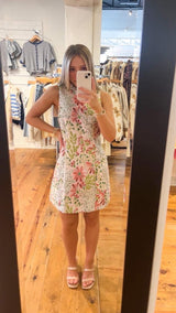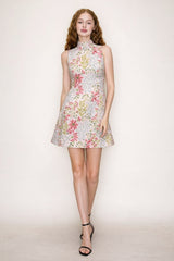 This sleeveless mini dress features an elegant floral jacquard pattern with a sophisticated high neckline and convenient back zipper closure. Crafted from a polyester shell with a stretchy lining blend, it offers both comfort and structure. Perfect for adding a feminine, polished touch to your wardrobe for any occasion.