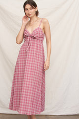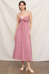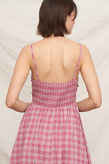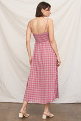 Embrace timeless charm with the Mae Gingham Midi Dress in soft pink plaid. This classic piece features a flattering sweetheart neckline and midi length, perfect for casual outings or dressed-up occasions. Crafted from a breathable cotton-spandex blend with polyester lining, it offers comfort and gentle stretch throughout the day. The iconic gingham pattern adds vintage-inspired appeal to any wardrobe. Hand wash cold and line dry to maintain the fabric's quality and vibrant color.