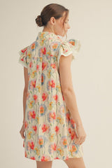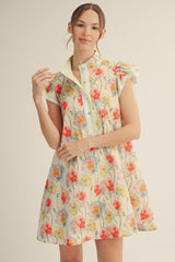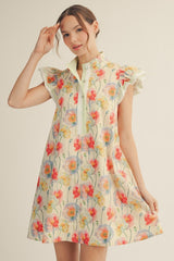 Twirl into spring with the Reagan Floral Mini Dress in cheerful banana yellow. This charming piece features a classic collar, delicate floral print, and playful ruffle sleeves that add just the right amount of whimsy. Perfect for brunch dates, garden parties, or whenever you want to brighten someone's day—including your own. A versatile wardrobe essential that transitions effortlessly from casual to dressed-up occasions.