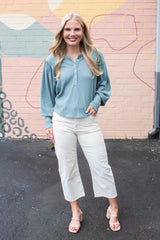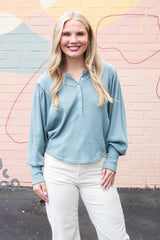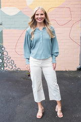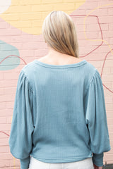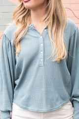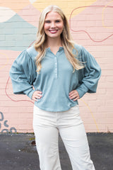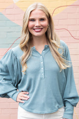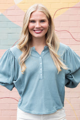 The Quinn Knit Top in Jade Ash combines cozy comfort with playful style. Featuring a charming button closure and a flattering round neck, this top showcases delicate pointelle knit patterns for subtle texture. Long balloon sleeves add a whimsical touch, while raw seam details bring an effortless, laid-back vibe to your look. Perfect for adding a bit of fun and flair to your everyday wardrobe!