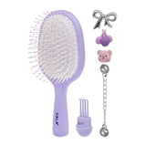 CALA Purple Bristle Bitz Charm Hair Brush. A playful yet functional hair brush designed to detangle, smooth, and style with ease. This charming brush features soft, flexible bristles that glide effortlessly through hair, helping reduce tangles, minimize breakage, and enhance everyday styling comfort. The set includes four pop & swap decorative charms, allowing for easy personalization and a fun, customizable look. A hidden brush cleaner is included for easy removal of trapped hair, helping to maintain the brush’s cleanliness and longevity. The detachable charms and playful design make this brush both stylish and practical for everyday use. 6 pcs per pack.