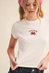 Don't let a grumpy mood get you down—rock this adorable embroidered baby tee instead! Featuring a cheeky crab design that'll make everyone smile, this fitted tee is perfect for casual days when you want to keep things light and fun. Soft, comfortable, and undeniably cute, it's the kind of piece that turns a regular outfit into a conversation starter. Pair it with your favorite jeans or shorts for effortless style.