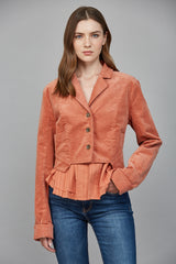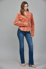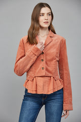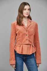 Meet the Carrington Corduroy Jacket—a soft orange stunner that refuses to blend in. This button-down blazer brings the fun with its signature contrast ruffled peplum hem, long sleeves, and handy front pockets. The rich corduroy texture adds depth and dimension to your wardrobe, whether you're layering over a dress or pairing it with your favorite jeans. It's the kind of jacket that makes getting dressed feel like an adventure. Dry clean recommended to maintain its vibrant look and playful charm.