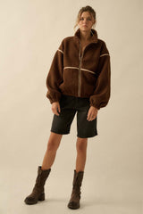 Cozy meets cool in the Hannah Sherpa Jacket in Chocolate! With soft sherpa lining and playful long balloon sleeves, this jacket wraps you in warmth and style. The chic mock neck and faux leather trim add a trendy edge, while side pockets and a zip-up closure keep things practical and snug. Perfect for crisp days when you want to feel comfy without sacrificing flair!