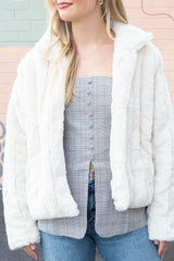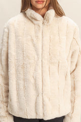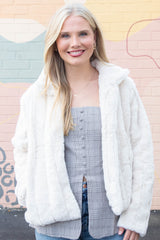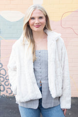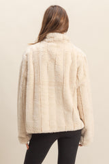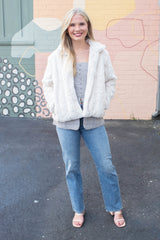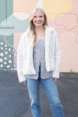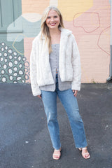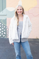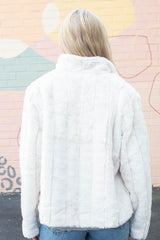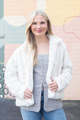 Wrap yourself in cozy charm with the Sarah Faux Fur Jacket in ivory. Featuring a chic mock neck and handy side pockets, this jacket is perfect for adding a touch of playful elegance to chilly days. Soft, stylish, and irresistibly warm—get ready to turn heads and stay snug all season long!