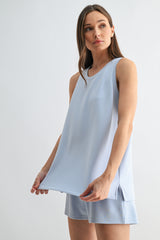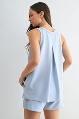 Dive into style with the Thea Scuba Sleeveless Tee in Halogen Blue. This sleek, armhole-friendly design keeps you cool and comfortable whether you're hitting the beach or just channeling that water-loving vibe. The scuba fabric delivers a structured, modern look that works solo or layered. Perfect for anyone who wants to make a splash in their everyday wardrobe.