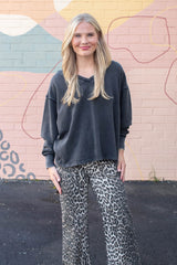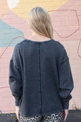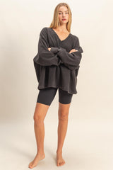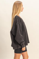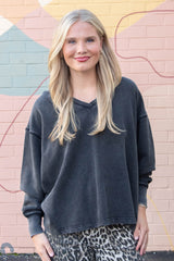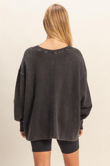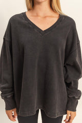 Cozy up in the Melody Oversized V-Neck Sweatshirt, your new favorite go-to for chilly days. With its plush fleece interior and relaxed fit, it feels like a warm hug you never want to take off. The playful long sleeves and washed black color bring effortless style to your casual wardrobe. Perfect for lounging or layering, this sweatshirt makes comfort look cool!