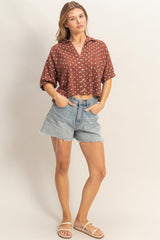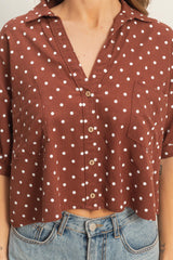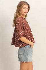 Playful polka dots meet effortless style in this charming crop top. The short sleeves and cropped silhouette create a fun, flirty look that pairs perfectly with high-waisted bottoms for a balanced fit. Crafted in a warm chestnut tone, this piece brings vintage-inspired flair to your everyday wardrobe. Whether you're dressing up for a night out or keeping it casual, this polka dot essential delivers personality and comfort in one adorable package.
