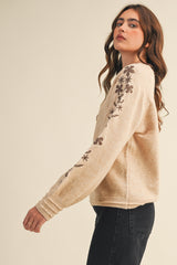 Angie Floral Embroidered Sweater, Oatmeal Brown