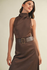 Effortless elegance meets modern flair in this sleeveless maxi dress. The high draped neckline adds a touch of sophistication, while the cinched belt defines your silhouette beautifully. Perfect for everything from brunch dates to evening events, this solid style is your go-to piece for looking polished without trying too hard. Slip it on and let the dress do the talking.