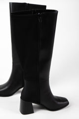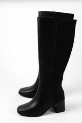 The Dahlia Tall Dress Boot is your ticket to effortless elegance. Designed in sleek black faux leather with a stretchy back panel that hugs your leg just right, these imported boots slip on via inner zipper for zero fuss. Balanced on a chic 2.5" heel, they're the perfect partner for everything from cocktail nights to special occasions. Dressy, comfortable, and ready to steal the show.