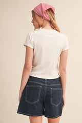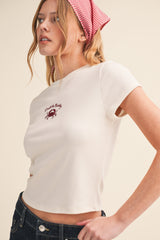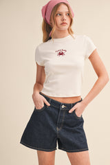 Don't let a grumpy mood get you down—rock this adorable embroidered baby tee instead! Featuring a cheeky crab design that'll make everyone smile, this fitted tee is perfect for casual days when you want to keep things light and fun. Soft, comfortable, and undeniably cute, it's the kind of piece that turns a regular outfit into a conversation starter. Pair it with your favorite jeans or shorts for effortless style.