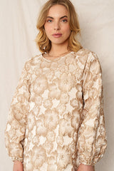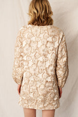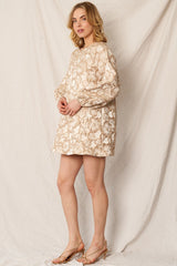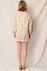 Introducing the Ezra—a mini dress that's equal parts sophisticated and fun! This charming piece features an intricate jacquard floral print in cream and gold tones that catches the light beautifully. Long sleeves keep things polished while the lined construction ensures comfort and confidence. Perfect for elevating your everyday look or dressing up for a night out, this mini length silhouette is designed to flatter and make a statement. Whether you're heading to brunch or a special occasion, the Ezra brings effortless elegance with a playful twist.