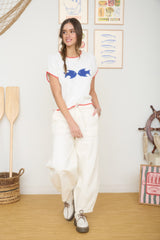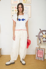 Dive into style with this charming Fish Jacquard sweater, featuring an adorable fish pattern in a soft cream base. The playful jacquard design is elevated with contrasting trim details that add visual interest and dimension. Perfect for casual outings or cozy days at home, this short-sleeve sweater brings a whimsical touch to your wardrobe. Whether you're a seafood lover or just appreciate quirky knitwear, this piece is sure to make a splash with its unique personality and comfortable fit.