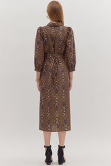 Introducing the Kara Floral Midi Dress—your new go-to for effortless charm! This brown beauty features romantic 3/4 puff sleeves and a flattering tie waist that cinches just right. The button-down neckline with collar adds a polished touch, while the cheerful floral print brings personality to every outfit. Midi length keeps things sophisticated, and practical side pockets? Yes, please! Perfect for brunch dates, garden parties, or whenever you want to feel put-together without trying too hard.