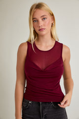 This sleek Lea Sleeveless Top in Burgundy brings effortless elegance with its draped cowl neck and breathable mesh construction. Crafted from a stretchy nylon-spandex blend, it hugs your curves in all the right ways while moving with you throughout the day. The double-layered design adds subtle dimension and coverage, making it perfect for layering or wearing solo. Semi-fitted and incredibly flexible, this versatile piece transitions seamlessly from casual to dressed-up vibes.