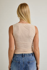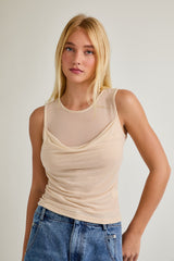 This sleek Lea Sleeveless Top in Cream brings effortless elegance with its draped cowl neck and breathable mesh construction. Crafted from a stretchy nylon-spandex blend, it hugs your curves in all the right ways while moving with you throughout the day. The double-layered design adds subtle dimension and coverage, making it perfect for layering or wearing solo. Semi-fitted and incredibly flexible, this versatile piece transitions seamlessly from casual to dressed-up vibes.