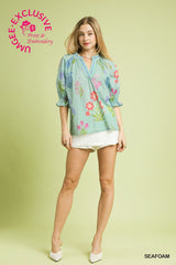 Bloom into spring with the Maeve Floral Top, where delicate florals meet timeless style. This seafoam beauty features a charming striped placket that adds just the right touch of visual interest. Perfect for layering or wearing solo, it's the kind of piece that makes getting dressed feel like a celebration. Designed for the modern woman who loves color and comfort in equal measure.