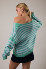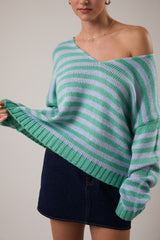 The Manny Stripe Sweater brings effortless style to your everyday rotation. Featuring a classic V-neckline and cozy long sleeves, this mint and blue striped beauty layers like a dream over tees or stands solo as your go-to casual piece. Soft, comfortable, and endlessly versatile—it's the sweater that works as hard as you do, minus the stress.
