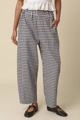 Marcy Gingham Baggy Pants, Black/White Throw on these effortlessly cool gingham pants and let comfort do the talking. The classic black and white check pattern brings retro vibes to any outfit, while the relaxed baggy silhouette keeps things laid-back and fun. An elastic waistband means you can move freely without fussing—perfect for days when you want to look put-together without the fuss. Whether you're running errands or hanging with friends, these pants are your new go-to for casual style that actually feels as good as it looks.