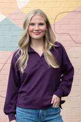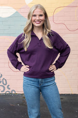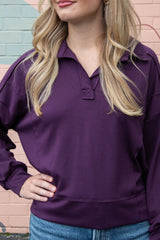 Stay stylish and comfortable with our Neo Knit Polo Sweatshirt in Plum. This collared sweatshirt features seam details and long sleeves for a polished look, while the side slits offer ease of movement. Perfect for any casual occasion.