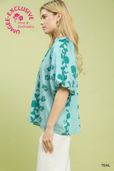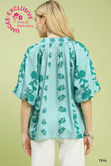 Make a statement with this eye-catching teal top featuring playful bubble sleeves that add instant dimension and fun to your everyday look. The vibrant printed design brings personality to your wardrobe, while the voluminous sleeves create a trendy silhouette that's equal parts bold and wearable. Perfect for dressing up basics or standing out at casual gatherings, this Nova top transforms any outfit into something special.
