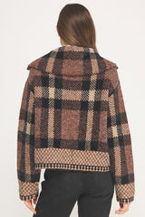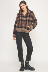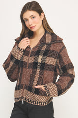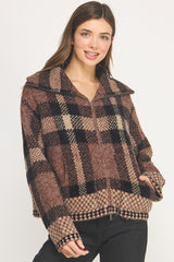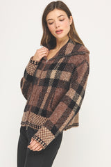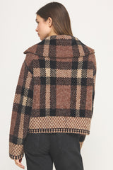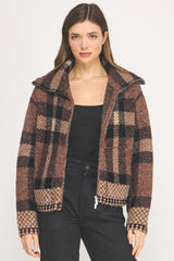 Layer up with our Plaid Bomber Knit Jacket in a rich brown mix—the perfect blend of cozy and cool. This long-sleeve knit features a classic plaid pattern and a smooth front zipper for easy styling. Whether you're heading out for a casual day or want to add some texture to your look, this bomber delivers warmth and vintage-inspired charm that works with everything in your closet.